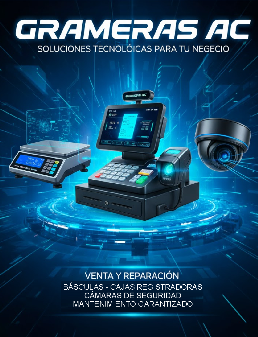 Grameras AC es una empresa caleña dedicada a la venta, reparación y mantenimiento de balanzas, cajas registradoras y sistemas de cámaras de seguridad. Contamos con un equipo técnico especializado que ofrece atención personalizada y servicio a domicilio en toda la región del Valle del Cauca. Nos destacamos por nuestra responsabilidad, puntualidad y compromiso con cada cliente, brindando soluciones precisas y confiables para negocios, tiendas y empresas. Además, ofrecemos opciones de venta a crédito y de contado, facilitando el acceso a equipos de alta calidad que garantizan el correcto funcionamiento de tus operaciones comerciales.